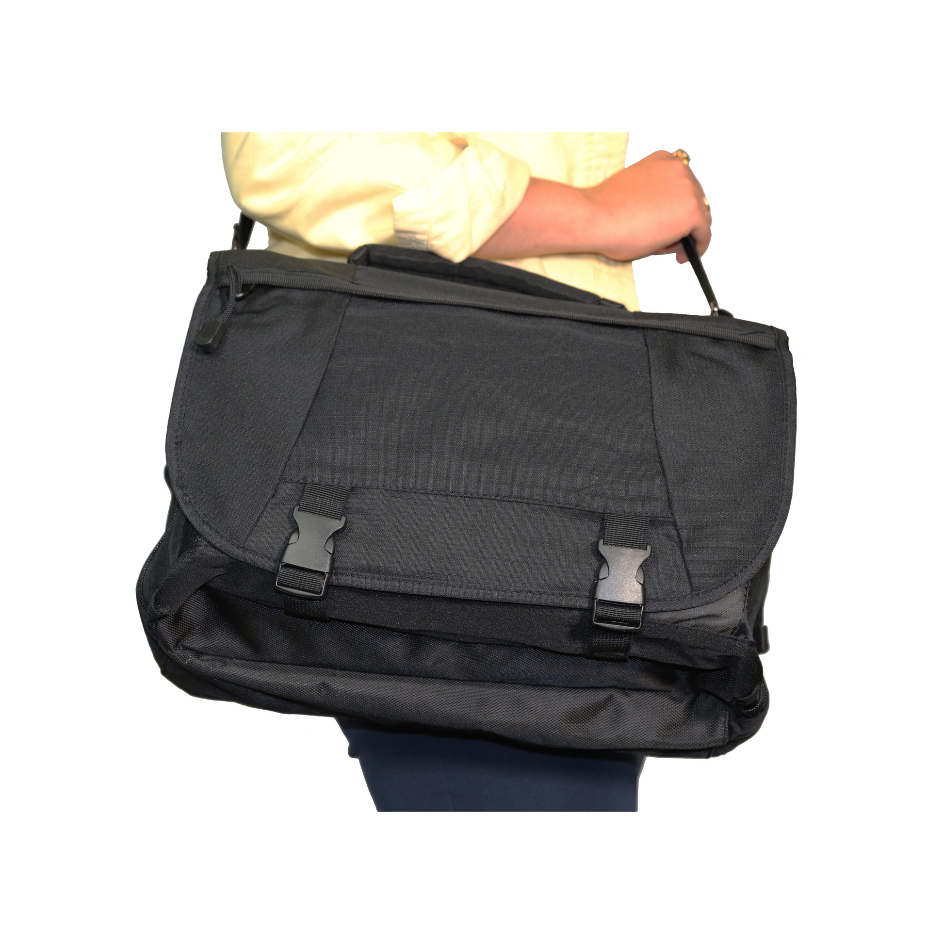 Spectrum’s large Messenger Bag has ample room and a variety of storage sections to store just about everything you need for a busy day at work and school. The padded shoulder straps make the bag easy to carry and helps to reduce shoulder stress during use. The strap is detachable and removable and can convert from a briefcase into a cross-body shoulder bag, Two front buckles snap for safe travels and adjust for a secure fit. One large main compartment holds books, clothes, documents and other items. An inner padded laptop compartment offers protection for mid-sized laptops and other electronics. An additional sleeve compartment holds more flat items and the assorted smaller pockets allow for quick easy access to smaller items. Two additional side zippered pouches can store and hide even more necessities.